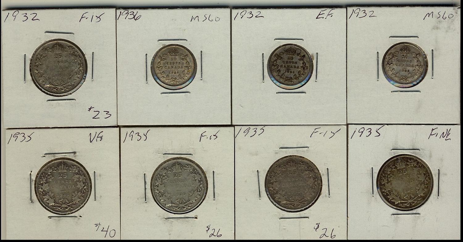 1932 10¢(2), 1936 10¢, 1932 25¢, & 1935 25¢(4). Lot of 8 coins VG to EF.