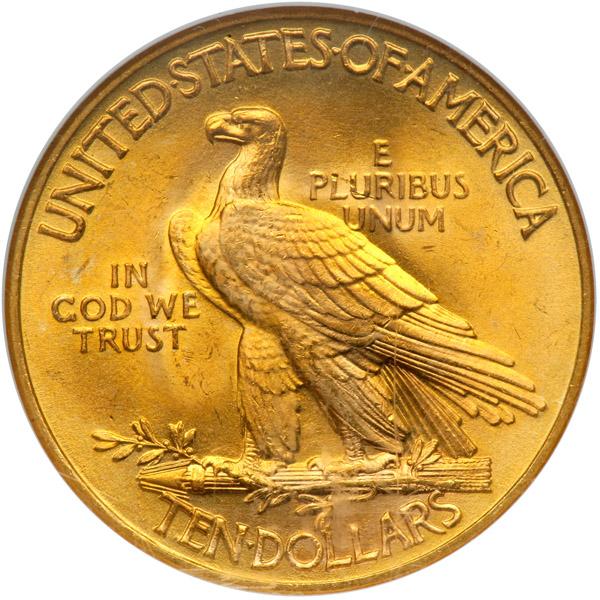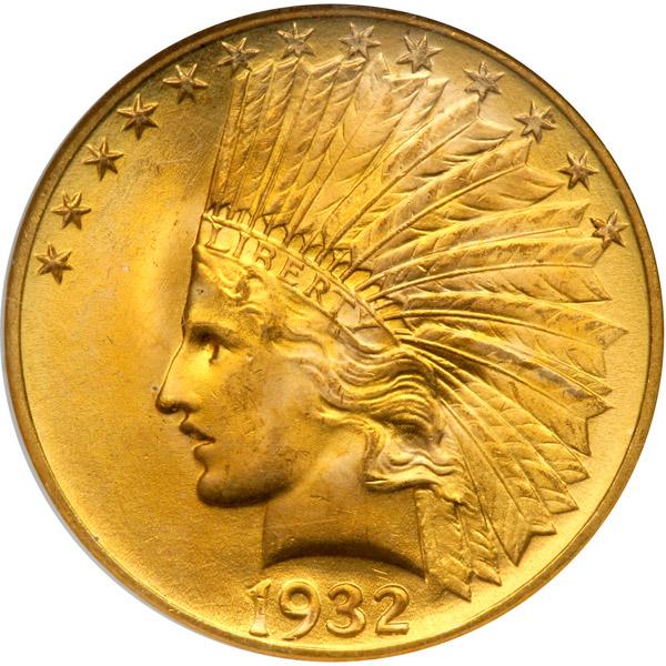 1932. NGC graded MS-67. Rich golden mint bloom color adds to its appeal. A gorgeous example, ideal for a top quality type set. Agreed, more than 4.4 million eagles were produced at the Philadelphia Mint in 1932 and, as such, this issue has little trouble edging out the 1926 as the most common Indian eagle in all grades. All the same, low grade Uncirculated survivors seem the most plentiful and Gems, while obtainable, are nevertheless scare. Primarily frosty, the surfaces show a tendency toward satiny texture with mesmerizing cartwheel effects. Every last design element is crisply defined. The rich vivid gold color swirls have to be seen to be fully appreciated. Pop 7; 1 finer in 67* (PCGS # 8884) .