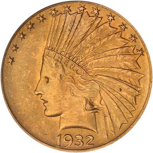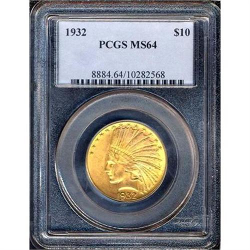 <b>1932 $10 Indian. PCGS graded MS64.</b> Only a few light scuffs in the frosty surface. The very choice example offered here not only shatters the normally seen bagmark woes, but its sparkling surfaces border on gem quality. In fact, only scattered marks like those on the face put a ceiling on the grade which might otherwise reach the 65 level <b>(PCGS # 8884)</b> <i>