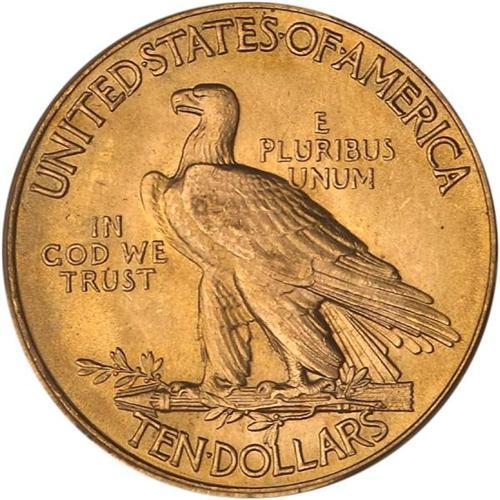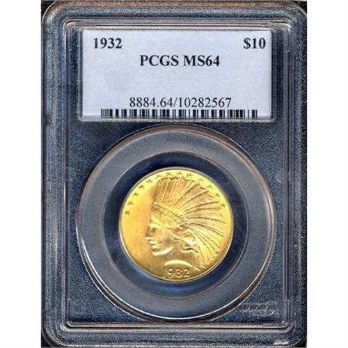 <b>1932 $10 Indian. PCGS graded MS64.</b> The surfaces are a vibrant golden bright, with nothing subtle about the luster, it glows. A few bagmarks away from the boundary line of the gem level <b>(PCGS # 8884)</b> <i>