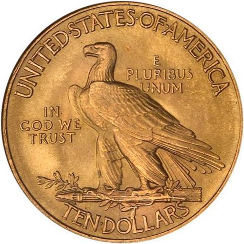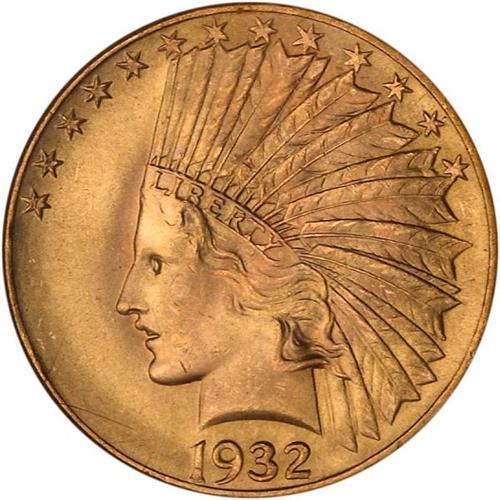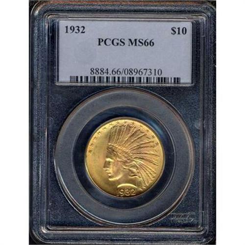 <b>1932 $10 Indian. PCGS graded MS66.</b> PCGS Pop: 68/1. Small mark on the chin. Nearly superb otherwise. Both sides are bright with vibrant golden-fresh patination, while the devices were struck with such force and energy by the dies that all design elements show completely <b>(PCGS # 8884)</b> <i>