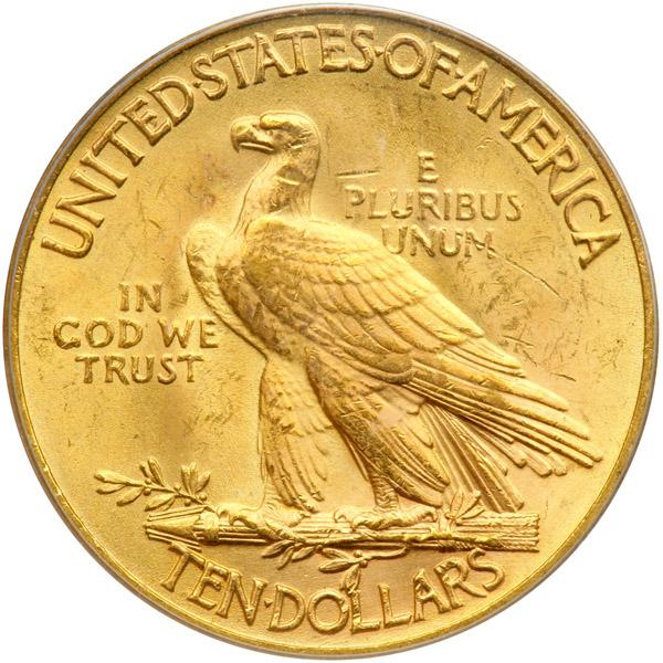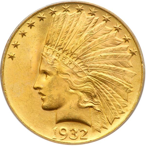 1932 $10 Indian. PCGS graded MS-64+ In a Secure Plus holder. Well struck with lovely mint bloom colors. A Premium Quality coin that should grade a full MS-65. Pop 45 in plus grade (PCGS # 8884) .