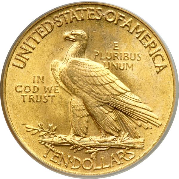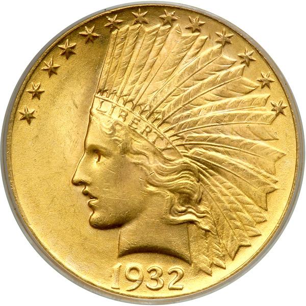 1932 $10 Indian. PCGS graded MS-63 PQ. Nice light gold toning with the premium quality appearance the brings out the bidders' check books (PCGS # 8884) .