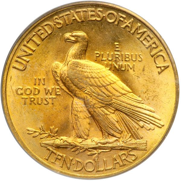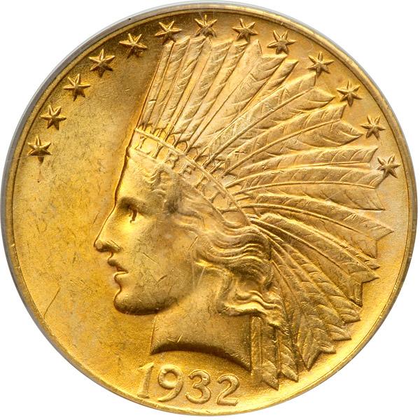 1932 $10 Indian. PCGS graded MS-65. A golden gem exhibiting natural two-tone colors. Luminous, satiny luster and first-rate color for this beautifully designed issue. The surfaces are fresh, origiinal. That said, now we cover the strike: this 1932, like most, was struck with scientific precision on the key design features and legends. Sharp detail everywhere. Pop 1057; 93 finer (PCGS # 8884) .