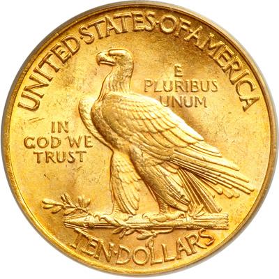 1932 $10 Indian. PCGS graded MS-62 PQ. Attractive light golden toning on both sides, frosty, beaming. Whereas a 1932 double eagle is extremely expensive, the 1932 $10 eagle is well within the reach of the everyday collector looking to own a coin right out of the Great Depression. In an old green label holder (PCGS # 8884).