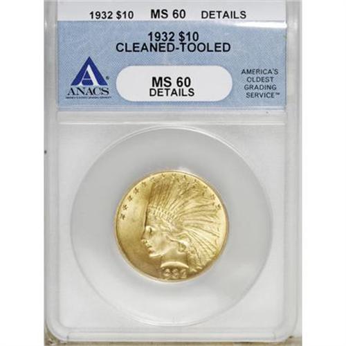 <B>1932 $10 --Cleaned, Tooled--ANACS. MS60 Details.</B></I> NGC Census: (416/31613). PCGS Population (608/31170). Mintage: 4,463,000. Numismedia Wsl. Price for NGC/PCGS coin in MS60: $610. (#8884)<BR><BR><B>Coin Engraver:</B> Augustus Saint-Gaudens<BR><BR><b>Shipping:</b> Coins & Currency (<a target="_blank" href="http://www.heritageauctions.com/common/shipping.php">view shipping information</a>)