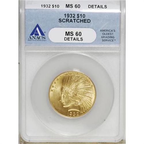 <B>1932 $10 --Scratched--ANACS MS60 Details.</B></I> NGC Census: (418/32257). PCGS Population (608/31522). Mintage: 4,463,000. Numismedia Wsl. Price for NGC/PCGS coin in MS60: $585. (#8884)<BR><BR><B>Coin Engraver:</B> Augustus Saint-Gaudens<BR><BR><b>Shipping:</b> Coins & Currency (<a target="_blank" href="http://www.heritageauctions.com/common/shipping.php">view shipping information</a>)