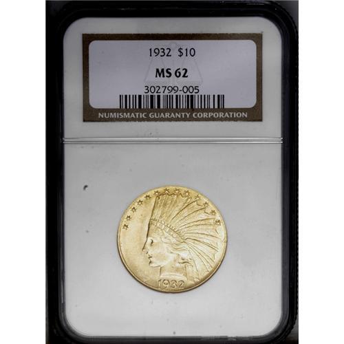 <B>1932<$10> MS62 NGC.</B></I> Lustrous and richly toned with good striking details. A number of shallow marks are observed on the reverse, and a few more are noted on the obverse. <BR><BR><B>Important notice:</B> Heritage usually auctions material at the rate of 200-250 lots per hour. On some occasions eBay Live bid software or the Internet may not be able to keep up with the pace of the auction. We recommend placing a realistic absentee bid now as insurance to avoid disappointment. Occasionally the auctioneer may eliminate or reject an eBay Live bid, and the auctioneer may also reopen a lot after the close of the eBay live bidding (usually because we missed an audience bid), and may reject your bid even if it shows you as the winning bidder. By bidding via eBay Live, you agree that Heritage may award the lot to another bidder at its sole discretion under the circumstances described above or any other reasonable circumstances. Since eBay bids are not shown to us until we open the lot on the floor, we treat those bids just like floor bids. In most cases the floor responds before the eBay bid is presented to us, due to Internet lag time, so for consistency we have made it a policy that floor bids are always considered first over tie eBay live bids. Also please note that all Heritage lots purchased through eBay Live carry a 20% Buyer's Premium. Please make sure you read the Terms and Conditions before you bid. This lot is being auctioned in conjunction with a live floor auction by Heritage Galleries & Auctioneers. All final auction and invoice information will be supplied by Heritage Galleries & Auctioneers, and all other information should be considered preliminary. Lot:4154 <BR><BR><B>Winning Notification and Billing:</B> After the FINAL session in this auction is complete, Heritage will send e-mail and snail mail invoices. This process normally takes several days. All final auction and invoice information will be supplied by Heritage Galleries & Auctioneers, and all other information should be considered preliminary. <BR><BR>This auction will be conducted on a live auction floor and over the Internet through eBay Live. If you choose to place an absentee bid, please take a moment to <font color='#0000ff'><u><a href='http://pages.ebay.com/liveauctions/help/before/laabsentee.html'>learn how eBay Live absentee bidding works</a></u></font><font color='#000000'>