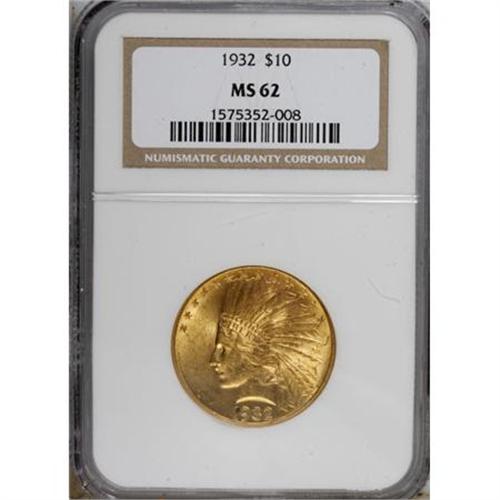 <B>1932 $10 MS62 NGC.</B></I> NGC Census: (8527/19873). PCGS Population (9991/18093). Mintage: 4,463,000. Numismedia Wsl. Price for NGC/PCGS coin in MS62: $930. (#8884)<BR><BR><b>Shipping:</b> Coins & Currency (<a target="_blank" href="http://www.heritageauctions.com/common/shipping.php">view shipping information</a>)