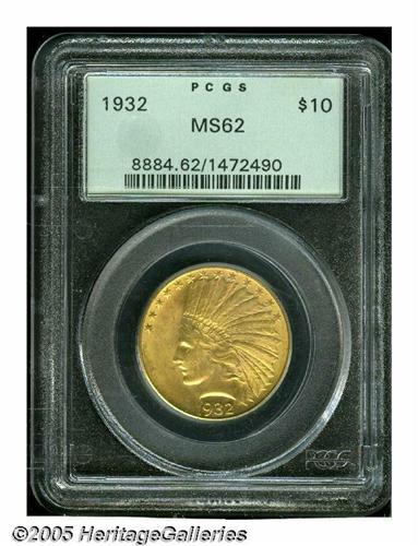 <B>1932<$10> MS62 PCGS.</B></I> A lovely coin with relatively clean surfaces and pleasing two-toned coloration. Perfect as a type coin.