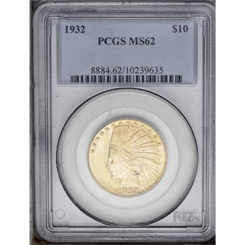 <B>1932<$10> MS62 PCGS.</B></I> Bright, frosty surfaces with appealing yellow-gold accents. A paper-thin mark above the date and another on Liberty's jaw limit the grade.