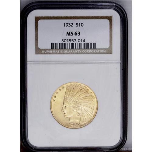 <B>1932 $10 MS63 NGC.</B></I> Each side is enlivened with bright luster and pretty apricot-gold color. The design elements are well brought up, and a few minute marks on Liberty's cheek and neck and in the left (facing) obverse field define the grade.