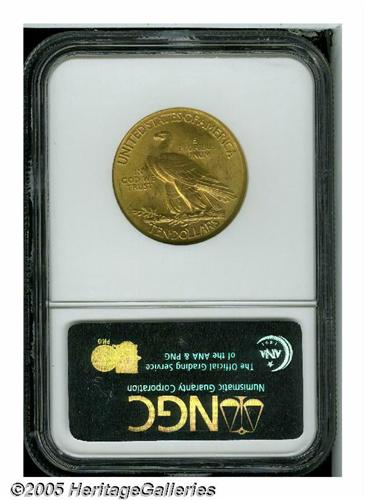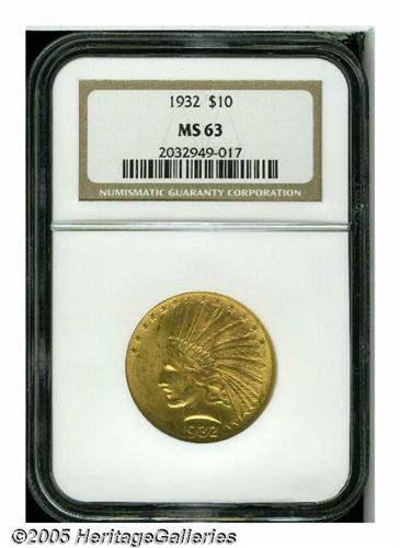 <B>1932<$10> MS63 NGC.</B></I> Greenish-gold lustrous surfaces exhibit sharply struck devices, though the eagle's left shoulder is a touch soft. A few conspicuous contact marks occur on Liberty's cheek and neck, limiting the grade.