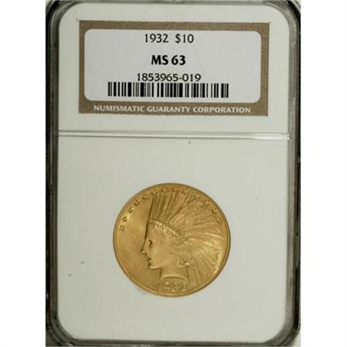 <B>1932 $10 MS63 NGC.</B></I> NGC Census: (11146/8664). PCGS Population (11639/6454). Mintage: 4,463,000. Numismedia Wsl. Price for NGC/PCGS coin in MS63: $1,460. (#8884)<BR><BR><b>Shipping:</b> Coins & Currency (<a target="_blank" href="http://www.heritageauctions.com/common/shipping.php">view shipping information</a>)