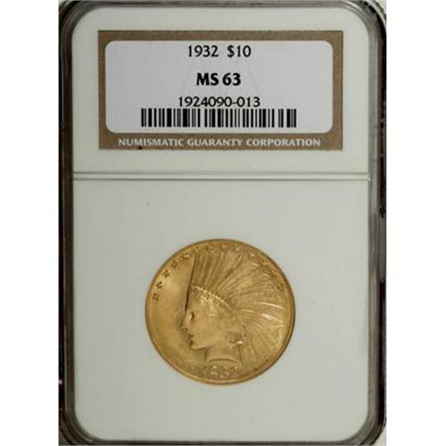 <B>1932 $10 MS63 NGC.</B></I> NGC Census: (11294/8811). PCGS Population (11729/6647). Mintage: 4,463,000. Numismedia Wsl. Price for NGC/PCGS coin in MS63: $1,260. (#8884)<BR><BR><B>Coin Engraver:</B> Augustus Saint-Gaudens<BR><BR><b>Shipping:</b> Coins & Currency (<a target="_blank" href="http://www.heritageauctions.com/common/shipping.php">view shipping information</a>)