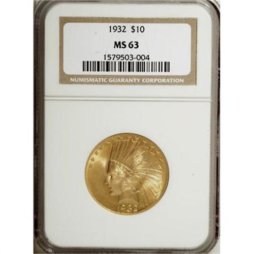 <B>1932 $10 MS63 NGC.</B></I> NGC Census: (11510/9168). PCGS Population (11808/7042). Mintage: 4,463,000. Numismedia Wsl. Price for NGC/PCGS coin in MS63: $1,350. (#8884)<BR><BR><B>Coin Engraver:</B> Augustus Saint-Gaudens<BR><BR><b>Shipping:</b> Coins & Currency (<a target="_blank" href="http://www.heritageauctions.com/common/shipping.php">view shipping information</a>)