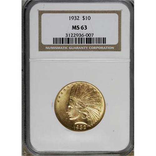 <B>1932 $10 MS63 NGC.</B></I> . NGC Census: (11637/9336). PCGS Population (11873/7106). Mintage: 4,463,000. Numismedia Wsl. Price for NGC/PCGS coin in MS63: $1,450. (#8884)<BR><BR><B>Coin Engraver:</B> Augustus Saint-Gaudens<BR><BR><b>Shipping:</b> Coins & Currency (<a target="_blank" href="http://www.heritageauctions.com/common/shipping.php">view shipping information</a>)
