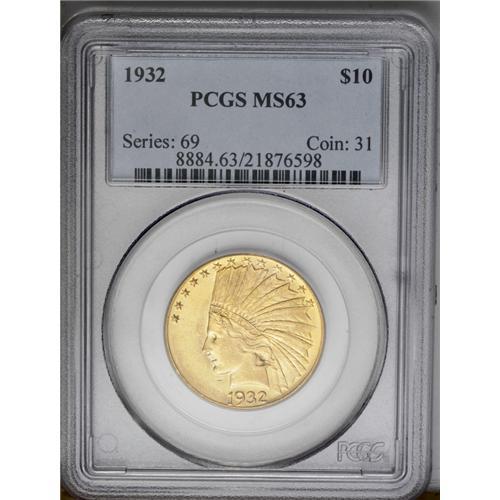 <B>1932<$10> MS63 PCGS.</B></I> A beautiful orange-gold example of this issue, one that is ever-popular despite its availability. The strike is boldly executed, although there is a touch of softness just at the centers, and the lustrous surfaces show only scattered evidence of contact under a loupe.