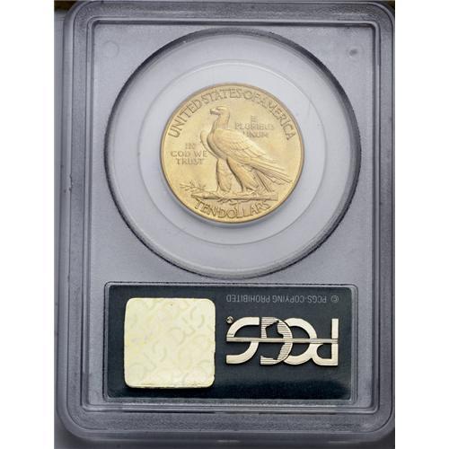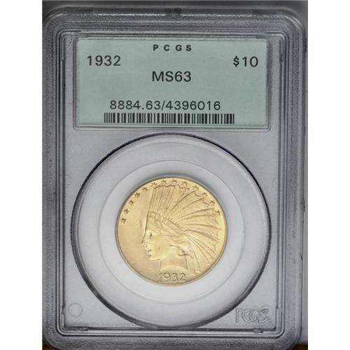 <B>1932<$10> MS63 PCGS.</B></I> Deep olive-gold and rose toning adorns vibrantly lustrous, matte-like surfaces. Small abrasions inhabit each side of the coin. Housed in a green label PCGS holder.