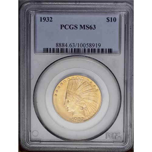<B>1932<$10> MS63 PCGS.</B></I> Exceedingly bright luster radiates from the matte-like surfaces of this yellow-golden example. Boldly struck with a few grade-limiting abrasions on each side.