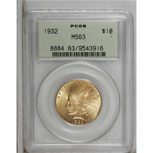 <B>1932 $10 MS63 PCGS.</B></I> Orange and green-gold alternate across this lustrous and attentively struck Indian ten. The cheek and neck exhibit moderate contact. In an old green label holder.<BR><BR><b>Shipping:</b> Coins & Currency (<a target="_blank" href="http://www.heritageauctions.com/common/shipping.php">view shipping information</a>)