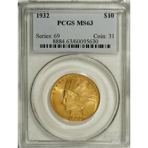 <B>1932 $10 MS63 PCGS.</B></I> PCGS Population (11639/6454). NGC Census: (11146/8664). Mintage: 4,463,000. Numismedia Wsl. Price for NGC/PCGS coin in MS63: $1,460. (#8884)<BR><BR><b>Shipping:</b> Coins & Currency (<a target="_blank" href="http://www.heritageauctions.com/common/shipping.php">view shipping information</a>)