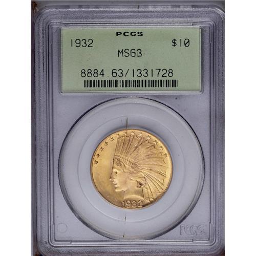 <B>1932<$10> MS63 PCGS.</B></I> Potent cartwheel luster illuminates this bright and refreshingly clean Indian eagle. Always available, but also under enormous type demand. Certified in an early generation holder.