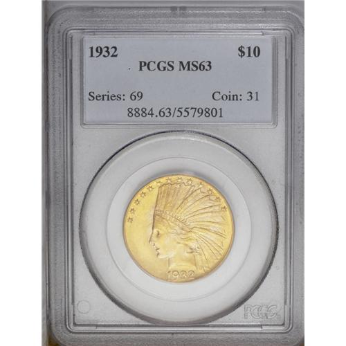 <B>1932<$10> MS63 PCGS.</B></I> Potent lemon-gold luster illuminates this carefully preserved large denomination gold type coin. The strike is bold except for the back claw and branch. <BR><BR><B>Important notice:</B> Heritage usually auctions material at the rate of 200-250 lots per hour. On some occasions eBay Live bid software or the Internet may not be able to keep up with the pace of the auction. We recommend placing a realistic absentee bid now as insurance to avoid disappointment. Occasionally the auctioneer may eliminate or reject an eBay Live bid, and the auctioneer may also reopen a lot after the close of the eBay live bidding (usually because we missed an audience bid), and may reject your bid even if it shows you as the winning bidder. By bidding via eBay Live, you agree that Heritage may award the lot to another bidder at its sole discretion under the circumstances described above or any other reasonable circumstances. Since eBay bids are not shown to us until we open the lot on the floor, we treat those bids just like floor bids. In most cases the floor responds before the eBay bid is presented to us, due to Internet lag time, so for consistency we have made it a policy that floor bids are always considered first over tie eBay live bids. Also please note that all Heritage lots purchased through eBay Live carry a 20% Buyer's Premium. Please make sure you read the Terms and Conditions before you bid. This lot is being auctioned in conjunction with a live floor auction by Heritage Galleries & Auctioneers. All final auction and invoice information will be supplied by Heritage Galleries & Auctioneers, and all other information should be considered preliminary. Lot:4156 <BR><BR><B>Winning Notification and Billing:</B> After the FINAL session in this auction is complete, Heritage will send e-mail and snail mail invoices. This process normally takes several days. All final auction and invoice information will be supplied by Heritage Galleries & Auctioneers, and all other information should be considered preliminary. <BR><BR>This auction will be conducted on a live auction floor and over the Internet through eBay Live. If you choose to place an absentee bid, please take a moment to <font color='#0000ff'><u><a href='http://pages.ebay.com/liveauctions/help/before/laabsentee.html'>learn how eBay Live absentee bidding works</a></u></font><font color='#000000'>