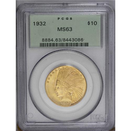 <B>1932 $10 MS63 PCGS.</B></I> Splendid lemon toning enriches this lustrous older holder Indian eagle. Moderate obverse marks do not deny the eye appeal. Certified in a green label holder.