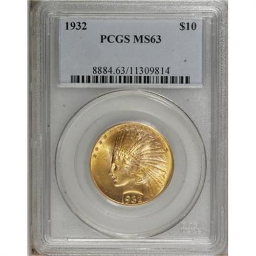 <B>1932 $10 MS63 PCGS.</B></I> A lustrous and nicely struck lemon-gold type coin from the final collectible year of the series. Minor distributed marks are typical for the grade.<BR><BR><b>Shipping:</b> Coins & Currency (<a target="_blank" href="http://www.heritageauctions.com/common/shipping.php">view shipping information</a>)