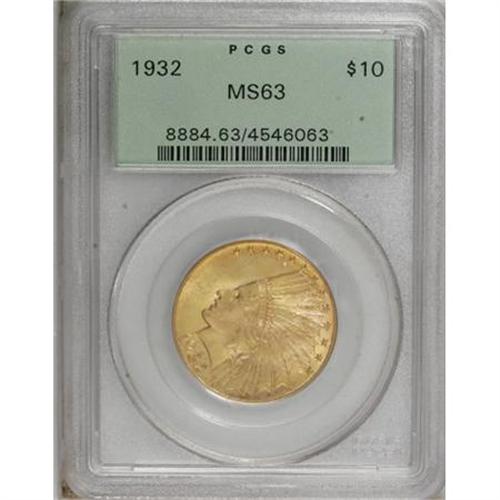 <B>1932 $10 MS63 PCGS.</B></I> PCGS Population (11689/6632). NGC Census: (11227/8779). Mintage: 4,463,000. Numismedia Wsl. Price for NGC/PCGS coin in MS63: $1,280. (#8884)<BR><BR><B>Coin Engraver:</B> Augustus Saint-Gaudens<BR><BR><b>Shipping:</b> Coins & Currency (<a target="_blank" href="http://www.heritageauctions.com/common/shipping.php">view shipping information</a>)