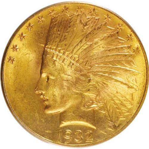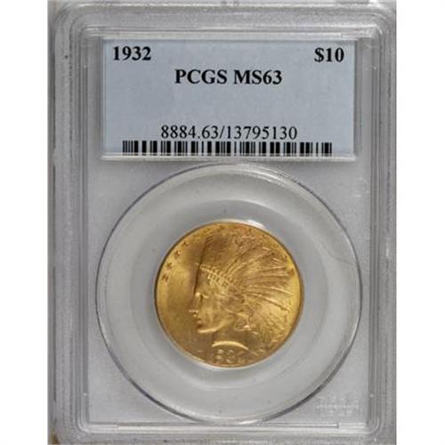 <B>1932 $10 MS63 PCGS.</B></I> PCGS Population (11732/6651). NGC Census: (11294/8811). Mintage: 4,463,000. Numismedia Wsl. Price for NGC/PCGS coin in MS63: $1,260. (#8884)<BR><BR><B>Coin Engraver:</B> Augustus Saint-Gaudens<BR><BR><b>Shipping:</b> Coins & Currency (<a target="_blank" href="http://www.heritageauctions.com/common/shipping.php">view shipping information</a>)