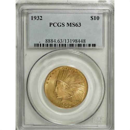 <B>1932 $10 MS63 PCGS.</B></I> PCGS Population (11732/6651). NGC Census: (11294/8811). Mintage: 4,463,000. Numismedia Wsl. Price for NGC/PCGS coin in MS63: $1,260. (#8884)<BR><BR><B>Coin Engraver:</B> Augustus Saint-Gaudens<BR><BR><b>Shipping:</b> Coins & Currency (<a target="_blank" href="http://www.heritageauctions.com/common/shipping.php">view shipping information</a>)