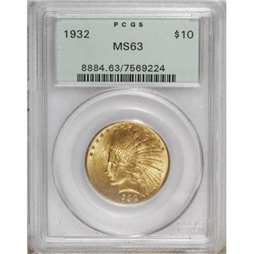<B>1932 $10 MS63 PCGS.</B></I> PCGS Population (11754/6925). NGC Census: (11421/9007). Mintage: 4,463,000. Numismedia Wsl. Price for NGC/PCGS coin in MS63: $1,260. (#8884)<BR><BR><B>Coin Engraver:</B> Augustus Saint-Gaudens<BR><BR><b>Shipping:</b> Coins & Currency (<a target="_blank" href="http://www.heritageauctions.com/common/shipping.php">view shipping information</a>)