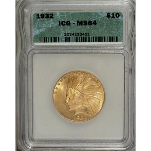 <B>1932 $10 MS64 ICG.</B></I> Satiny, swirling luster is the prime attribute of this captivating yellow-gold type piece. Well struck with solid visual appeal, though the portrait shows a few stray marks.<BR><BR><B>Coin Engraver:</B> Augustus Saint-Gaudens<BR><BR><b>Shipping:</b> Coins & Currency (<a target="_blank" href="http://www.heritageauctions.com/common/shipping.php">view shipping information</a>)