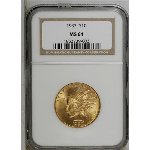 <B>1932 $10 MS64 NGC.</B></I> A nicely struck near-Gem with highly lustrous butter-yellow surfaces. Light marks are noted on the devices, which lack some definition on the highpoints.<BR><BR><b>Shipping:</b> Coin/Currency (<a target="_blank" href="http://www.heritageauctions.com/common/shipping.php">view shipping information</a>)