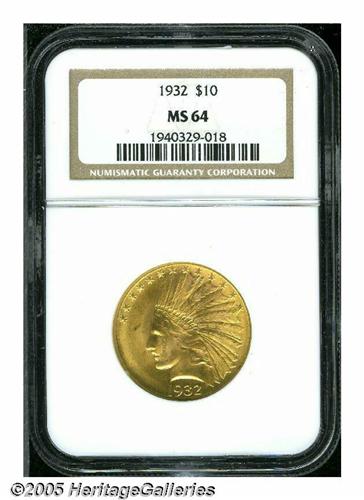 <B>1932<$10> MS64 NGC.</B></I> A satiny example with great luster, even color and good eye appeal. A contact mark and a small alloy spot, both in the headdress, are noted for accuracy.