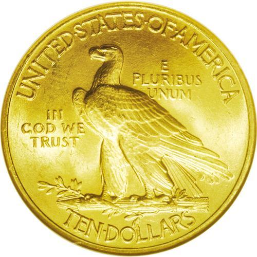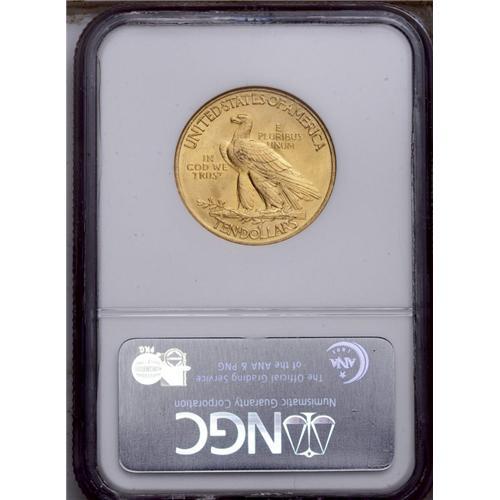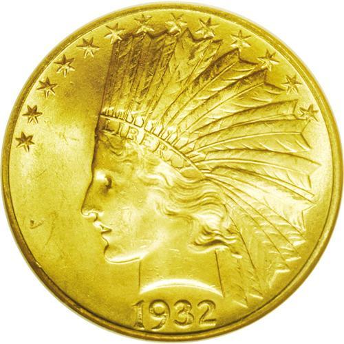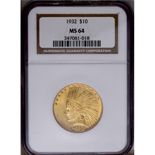 <B>1932<$10> MS64 NGC.</B></I> A sharply struck near-Gem with potent cartwheel luster. A number of small contact marks show on the obverse device and a rim cut is visible at 8 o'clock on the obverse. Still, an attractive, affordable type coin.