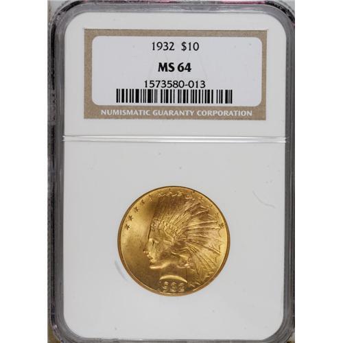<B>1932 $10 MS64 NGC.</B></I> A shimmering mustard-gold Choice Indian ten whose attentive strike and generally smooth fields confirm the MS64 grade. After World War I, gold coins little circulated, and since bankers preferred the more convenient double eagle, mintages of eagles at Philadelphia were limited to 1926 and 1932.<BR><BR><b>Shipping:</b> Coins & Currency (<a target="_blank" href="http://www.heritageauctions.com/common/shipping.php">view shipping information</a>)