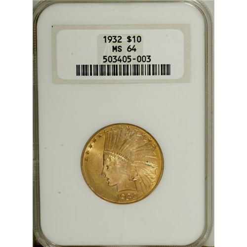 <B>1932 $10 MS64 NGC.</B></I> A thoroughly lustrous orange-gold Choice Indian ten from the final collectible year of issue. A tiny alloy spot is concealed within the headdress. Certified in a prior generation holder.<BR><BR><b>Shipping:</b> Coins & Currency (<a target="_blank" href="http://www.heritageauctions.com/common/shipping.php">view shipping information</a>)