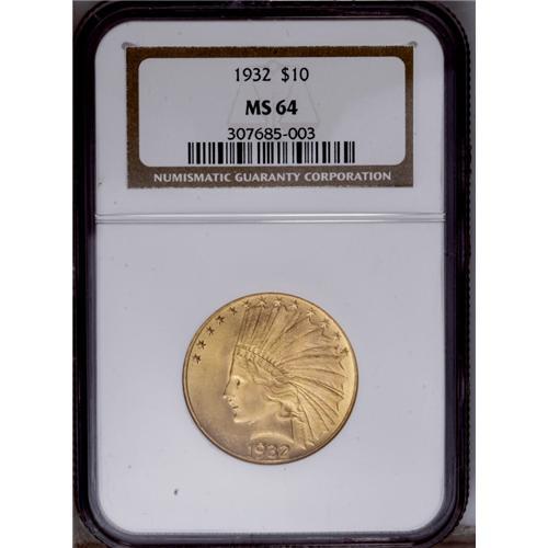 <B>1932<$10> MS64 NGC.</B></I> A very pleasing near-Gem with typically thick mint frost and lovely matte-like surface textures. The obverse is impeccably preserved and blemish-free, but the reverse displays a moderate number of small abrasions.