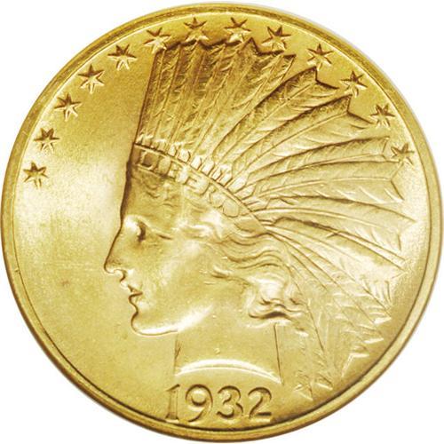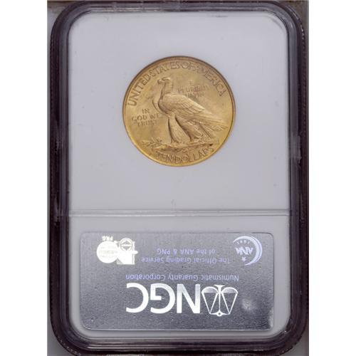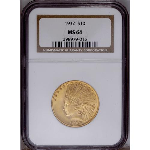 <B>1932 $10 MS64 NGC.</B></I> Appealing, highly lustrous copper-gold surfaces on this popular issue, the last readily obtainable issue of the series. The significant eye appeal of this specimen is limited only by a single nick at the corner of the Indian's eye, noticed with a loupe, that perhaps precludes a Gem designation. The few other scattered ticks are undistracting.