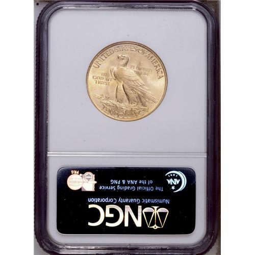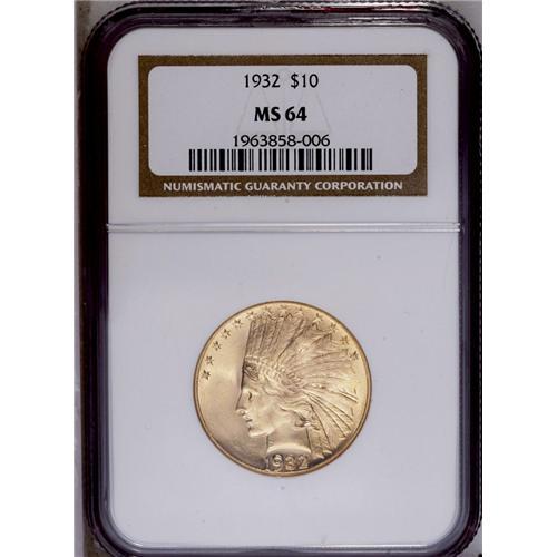 <B>1932<$10> MS64 NGC.</B></I> Blazing luster and exceedingly bright, matte-like surfaces characterize this typically struck, lightly abraded near-Gem. Brassy gold coloration covers each side.