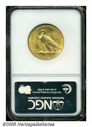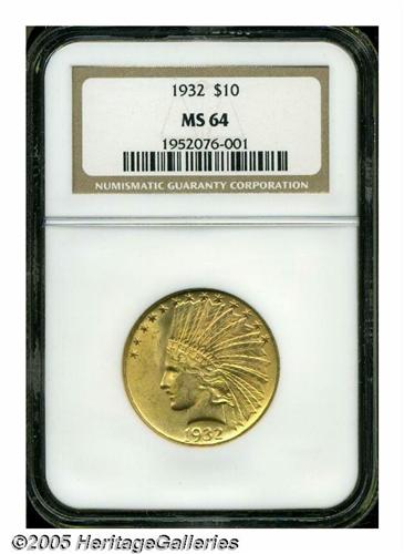 <B>1932<$10> MS64 NGC.</B></I> Bright yellow-gold surfaces are imbued with light tan color, and the design elements are adequately struck, save for softness on the eagle's shoulder. A few small contact marks located over each side limit the grade.
