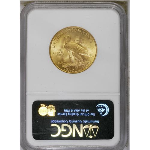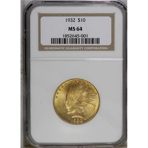 <B>1932<$10> MS64 NGC.</B></I> Classic American gold coins are artifacts of a time when the price of gold rarely changed, and then only by government decree. This near-Gem is solidly struck and has attractive luster. The wheat-gold surfaces have some isolated marks, including a few on the portrait, and a fingerprint appears in the lower left obverse field, but these flaws have little impact on the overall eye appeal.
