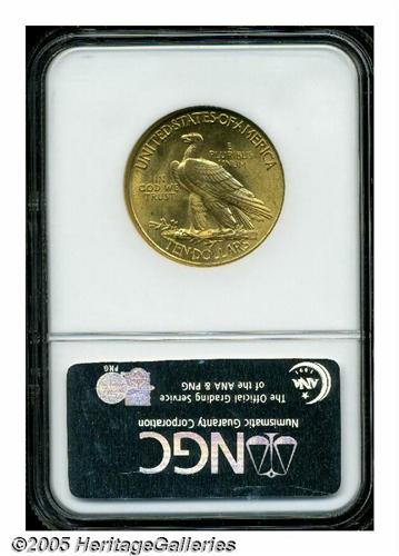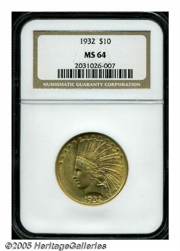 <B>1932<$10> MS64 NGC.</B></I> Lustrous surfaces display peach-gold patina and adequately struck design elements. A few trivial marks on the Indian's cheek and on the eagle's neck and shoulder limit the grade.