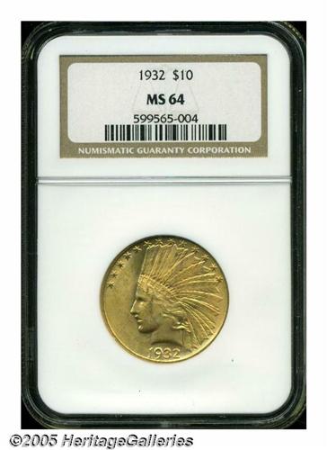 1932 $10 MS64 NGC. Peach-gold, lustrous surfaces