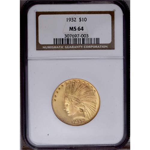 <B>1932<$10> MS64 NGC.</B></I> Pleasing color and luster, with just a few scattered marks precluding consideration as a Gem. Creamy red-gold luster flows across the surfaces. The perfect representative for a gold type set and superior for the grade.