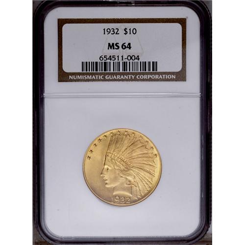 <B>1932<$10> MS64 NGC.</B></I> Shimmering, delicately toned surfaces with clean fields and a few grade-limiting ticks over the obverse and reverse.