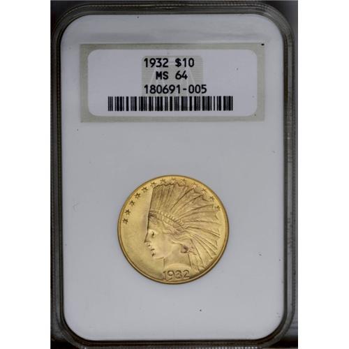 <B>1932<$10> MS64 NGC.</B></I> This appealing near-Gem exhibits bright, lustrous surfaces that are minimally abraded and show bright pink-gold color. <BR><BR><B>Important notice:</B> Heritage usually auctions material at the rate of 200-250 lots per hour. On some occasions eBay Live bid software or the Internet may not be able to keep up with the pace of the auction. We recommend placing a realistic absentee bid now as insurance to avoid disappointment. Occasionally the auctioneer may eliminate or reject an eBay Live bid, and the auctioneer may also reopen a lot after the close of the eBay live bidding (usually because we missed an audience bid), and may reject your bid even if it shows you as the winning bidder. By bidding via eBay Live, you agree that Heritage may award the lot to another bidder at its sole discretion under the circumstances described above or any other reasonable circumstances. Since eBay bids are not shown to us until we open the lot on the floor, we treat those bids just like floor bids. In most cases the floor responds before the eBay bid is presented to us, due to Internet lag time, so for consistency we have made it a policy that floor bids are always considered first over tie eBay live bids. Also please note that all Heritage lots purchased through eBay Live carry a 20% Buyer's Premium. Please make sure you read the Terms and Conditions before you bid. This lot is being auctioned in conjunction with a live floor auction by Heritage Galleries & Auctioneers. All final auction and invoice information will be supplied by Heritage Galleries & Auctioneers, and all other information should be considered preliminary. Lot:4174 <BR><BR><B>Winning Notification and Billing:</B> After the FINAL session in this auction is complete, Heritage will send e-mail and snail mail invoices. This process normally takes several days. All final auction and invoice information will be supplied by Heritage Galleries & Auctioneers, and all other information should be considered preliminary. <BR><BR>This auction will be conducted on a live auction floor and over the Internet through eBay Live. If you choose to place an absentee bid, please take a moment to <font color='#0000ff'><u><a href='http://pages.ebay.com/liveauctions/help/before/laabsentee.html'>learn how eBay Live absentee bidding works</a></u></font><font color='#000000'>